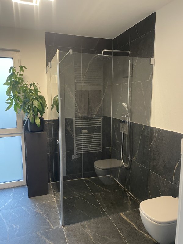 - Bäder mit bodentief gefliesten Duschen und modernem, großformatigem Natursteinfliesen (60x60)