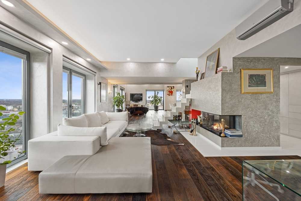 Beim Betreten der Wohnung im 22. Stock gelangt man in den zentralen Flur, welcher sowohl zwei (ev. auch drei) Schlafzimmer, Gästebad, Masterbad en Suite, Ankleideraum als auch den loftartigen luxuriösen und großzügigen Wohn- und Essbereich mit Kaminzimmer und die Küche erschließt.