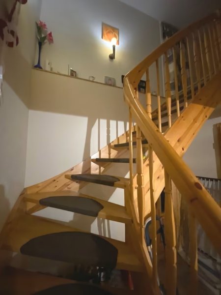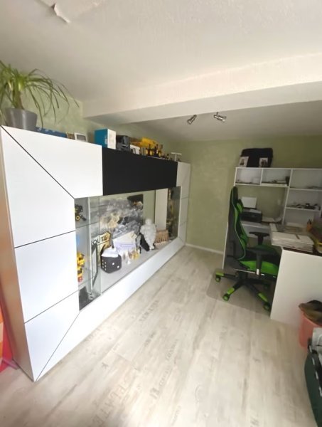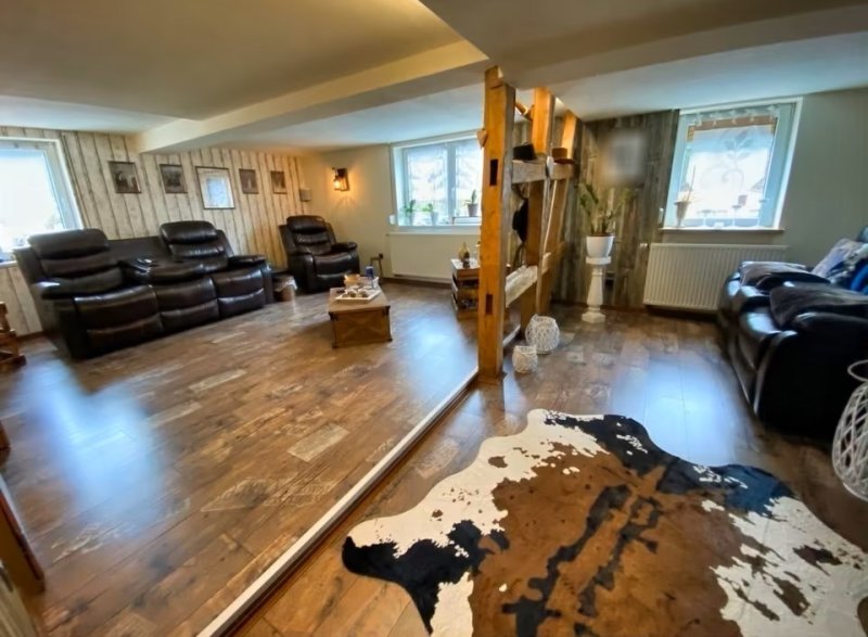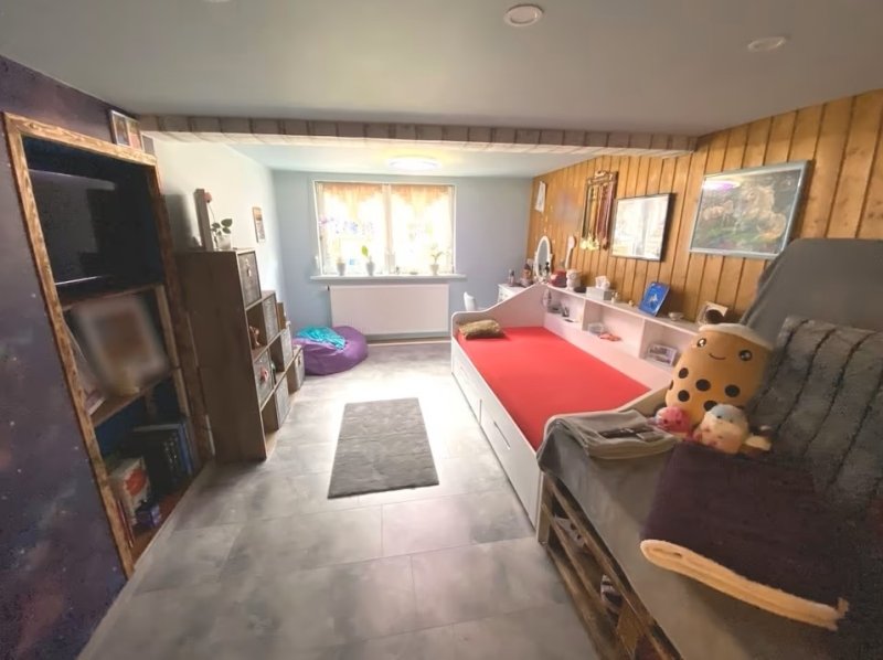 Über die Holztreppe gelangen sie dann ins Obergeschoss. Dort befinden sich das großzügig und im Westernstyle gestaltete Wohnzimmer mit angrenzendem Büro/Kinderzimmer. Ein zweites Kinderzimmer und ein weiteres Duschbad mit Waschmaschinenanschluss sowie eine Ankleide für die Kinder ergänzen den Wohnbereich im Obergeschoss. Eine Hobbywerkstatt bzw. Partyraum mit Ausgang zum Grundstück schließen das Obergeschoss ab. Der Dachboden ist nicht ausgebaut und kann als Nutzboden für Dekoartikel o. ä. genutzt werden. Alles in allem ein vielseitiges Einfamilienhaus mit wenig Renovierungsaufwand und bezugsfertig erwartet Sie auf einem Grundstück,