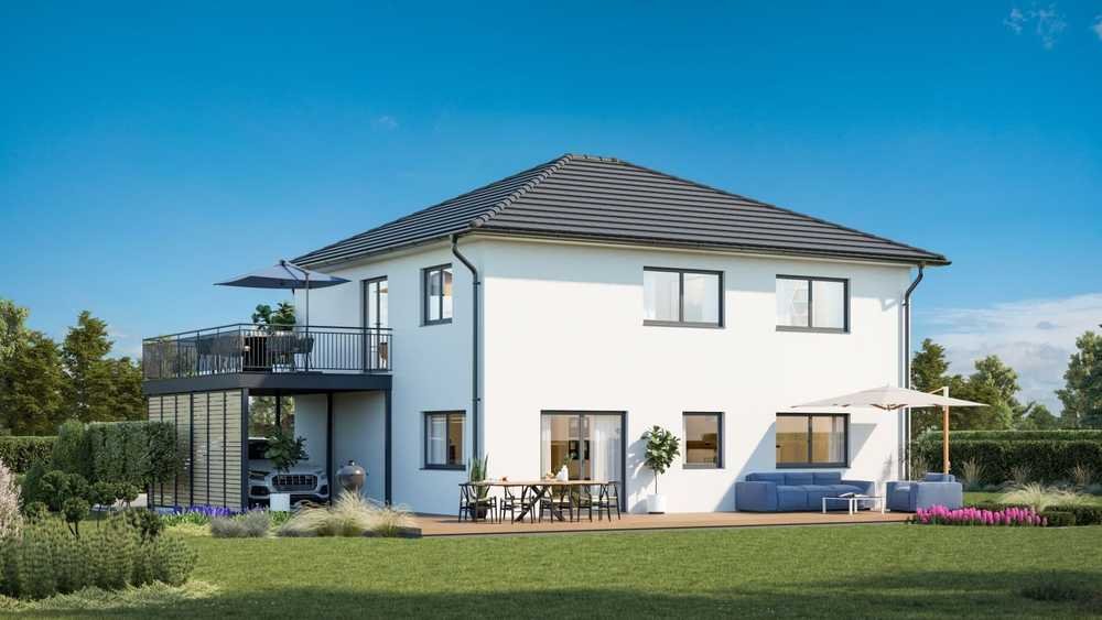 Der Technik- und Hauswirtschaftsraum kann integriert oder ausgelagert realisiert werden. Auch die Dachform bleibt variabel und lässt sich an Bebauungsplan und persönliche Vorstellungen anpassen. Im Obergeschoss ist ein Balkon optional möglich.