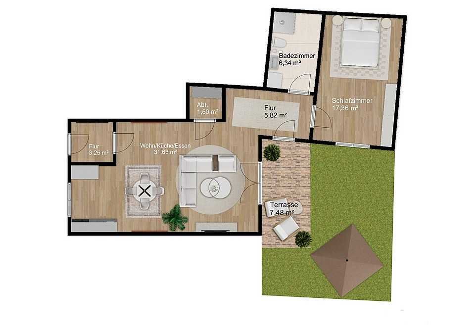 Der großzügige Wohn-/Ess- und Küchenbereich mit ca. 31,63 m² bildet das Herzstück der Wohnung. Große Fensterflächen sorgen für viel Tageslicht und schaffen eine angenehme Wohnatmosphäre. Von hier aus gelangen Sie direkt auf die ca. 7,48 m² große Terrasse mit angrenzendem Gartenbereich – perfekt zum Entspannen im Freien.