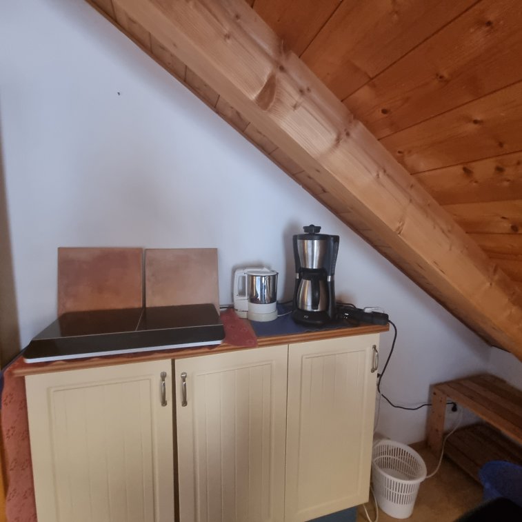 Kühlschrank, Kaffeemaschine, Wasserkocher, 2 Platten Induktion ist vorhanden.