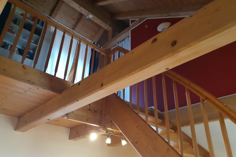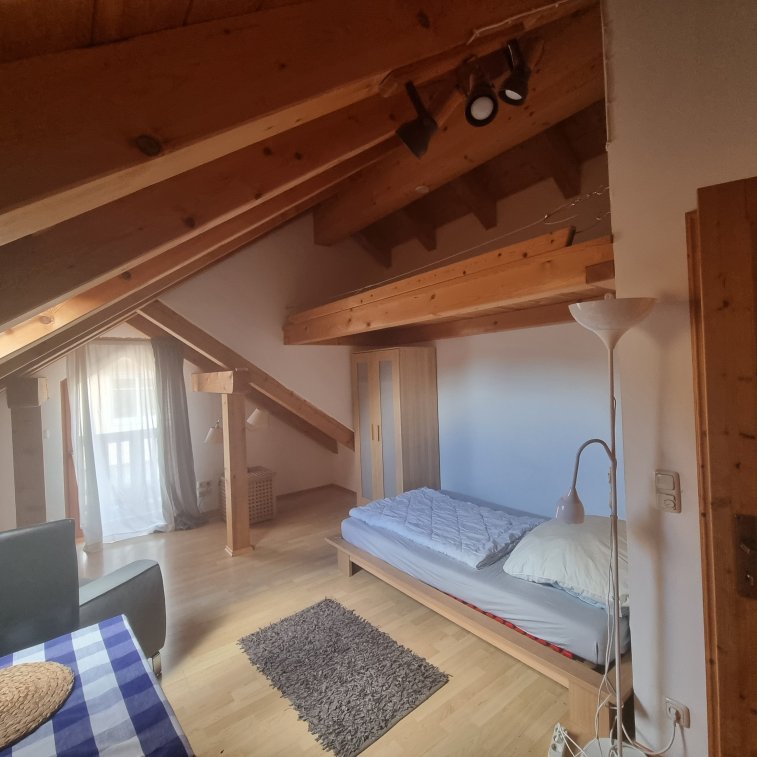 Es ist ein modernes möbliertes 25qm großes Zimmer im Dachgeschoß (gut isoliert) mit offener Balkensicht und befindet sich in einem Zweifamilienhauses, es ist mit einem Balkon und eigener Toilette und Dusche zur allein Nutzung ausgestattet.