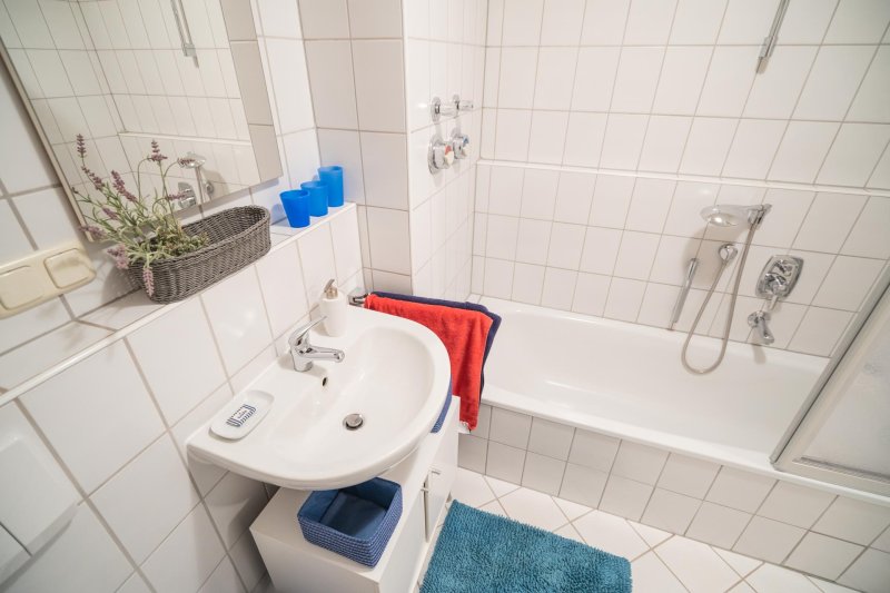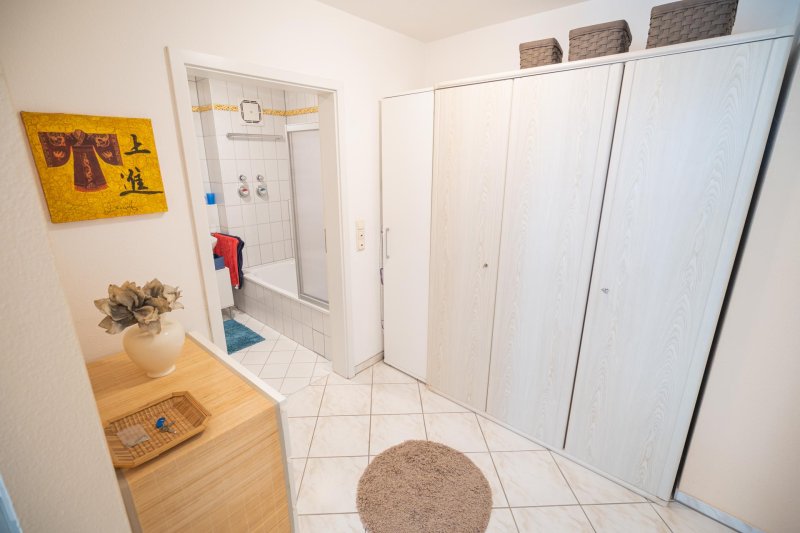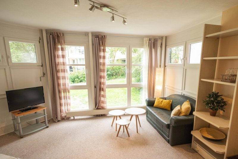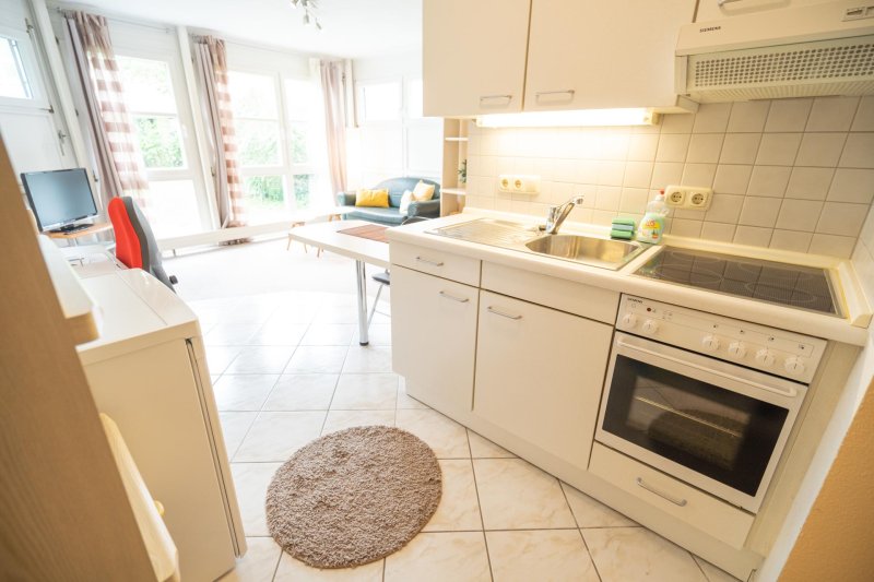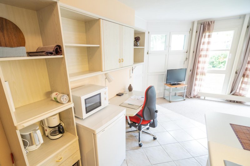 Die ruhige Wohnung mit Blick ins Grüne liegt im Erdgeschoss eines kleinen Mehrparteienhauses. Im Eingangsbereich befinden sich ein großer Kleiderschrank, eine Garderobe sowie eine Kommode, sodass genügend Stauraum zur Verfügung steht. Der große Raum umfasst einen gemütlichen Wohnbereich mit Sofa, Couchtisch und TV, einen Arbeitsbereich mit Schreibtisch und -stuhl sowie eine kleine Küchenzeile. Diese ist mit Cerankochfeld, Backofen, Mikrowelle und Kühlschrank ausgestattet. Hier befindet sich auch ein Esstisch mit zwei Stühlen. Der Schlafbereich mit einem Bett (1.40 m breit) ist separat gehalten. Das großzügige innenliegende Bad wartet mit einer Badewanne und einer kleinen Waschmaschine auf.