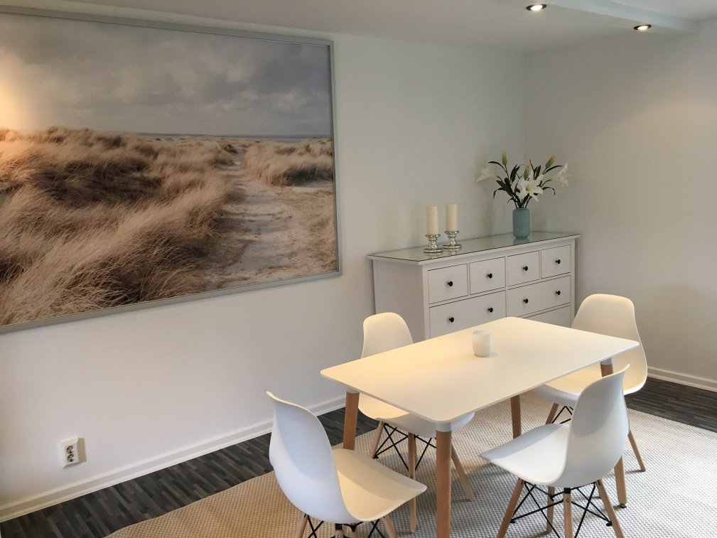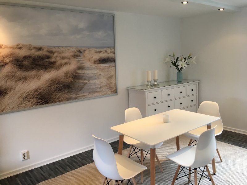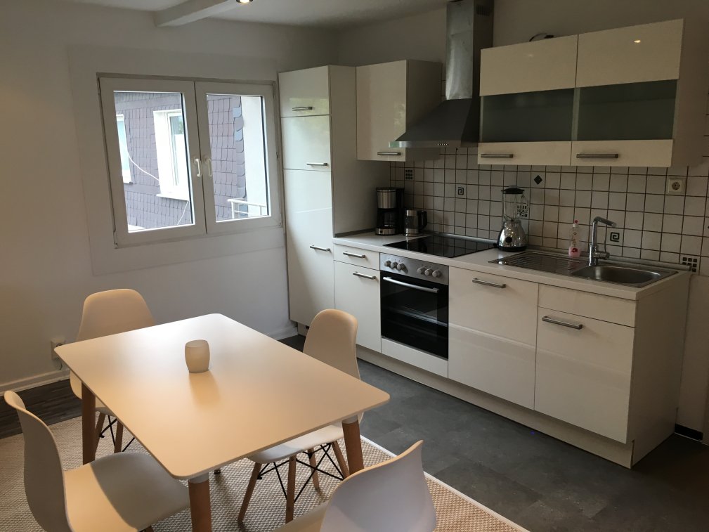 Die Wohnküche ist vollständig ausgestattet mit Herd, Cerankochfeld, Kaffeemaschine, Wasserkocher und Spülmaschine sowie mit sämtlichen Küchenutensilien, die für den Alltag nötig sind. Die passende Sitzgelegenheit findet man an dem neuen Esstisch mit 4 Stühlen.