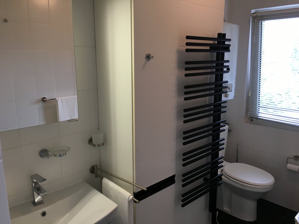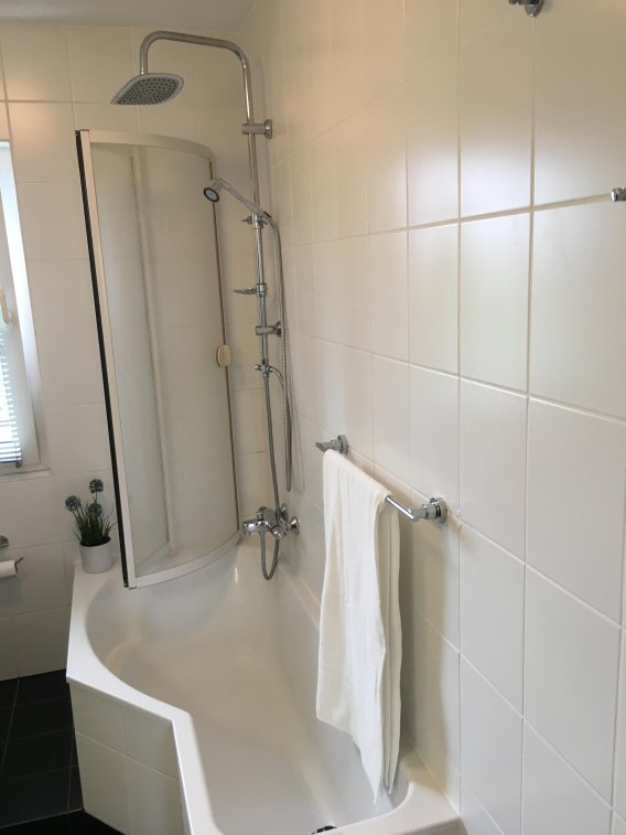 Im modern gefliesten Bad befindest sich eine Wanne mit Duschfunktion.