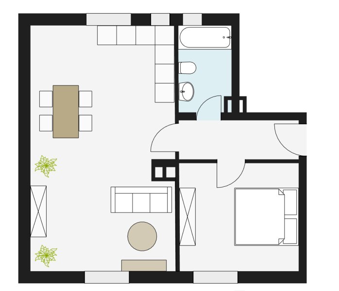 Die Wohnung ist mit Laminat ausgelegt und verfügt über ein Schlafzimmer und einen offenen, doppelten Raum der Wohnküche und Wohnzimmer kombiniert.