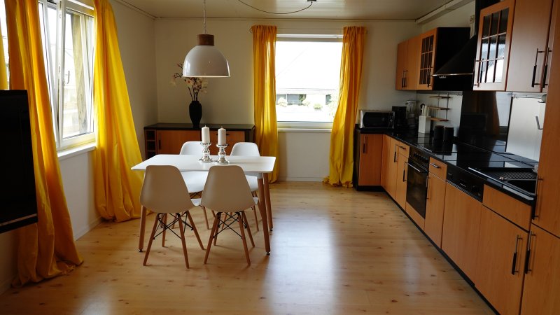Die Wohnküche ist vollständig ausgestattet mit Herd, Cerankochfeld, Kaffeemaschine, Wasserkocher und Spülmaschine sowie mit sämtlichen Küchenutensilien, die für den Alltag nötig sind. Die passende Sitzgelegenheit findet man an dem neuen Esstisch mit 4 Stühlen.
