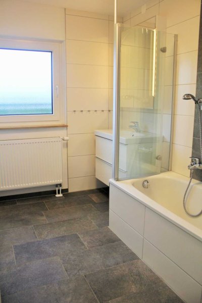 Die zwei Bäder haben ausreichend Badschränke und Haken. In einem Bad ist eine Dusche mit Vollglasduschkabine, im anderen eine Badewanne mit Glasduschkabine.