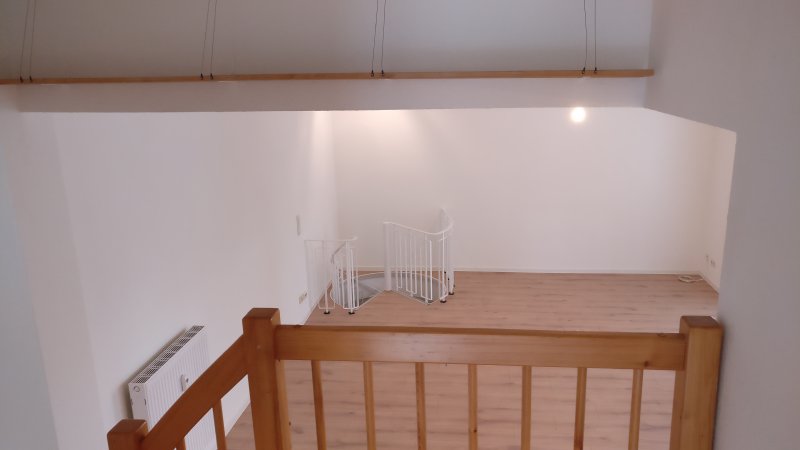 Im angrenzenden Flur führt eine Wendeltreppe in die großzügige Wohnebenen. Hier können Sie Ihren Wohn-, Ess- und Küchenbereich frei gestalten und zu Ihrem gemütlichen Heim werden lassen. Vom Wohnbereich gelangen Sie auf der Sonnenseite des Hauses, auf den Balkon. Entspannen Sie hier oder freuen Sie sich auf einen schönen Spaziergang im nahen Bad Nauheimer Wald. Direkt vor dem Balkon liegt ein kleiner Steingarten den Sie gerne mit Ihren Blumen oder Kräutern bepflanzen können. Vom Wohnzimmer gelangen Sie über eine schöne Holzempore in das 2 Schlafzimmer (Kinderzimmer, Gästezimmer, Büro). Die wirklich tolle Wohnung befindet sich im ruhigen Ortsteil von Ober Mörlen. Die A5 und B3 erreicht man in 3 Mi
