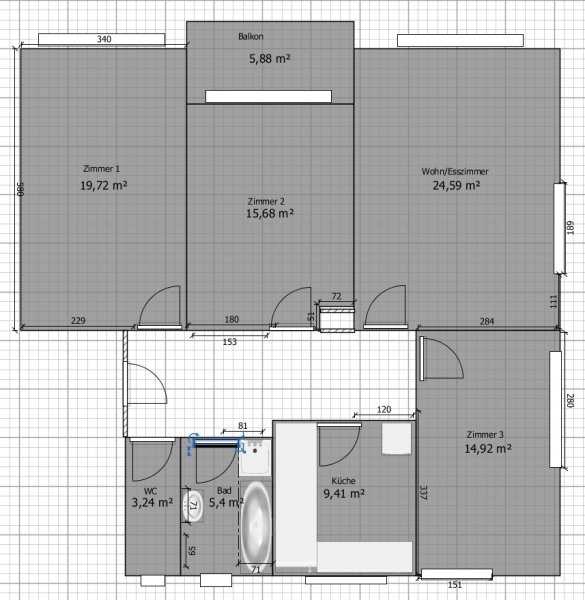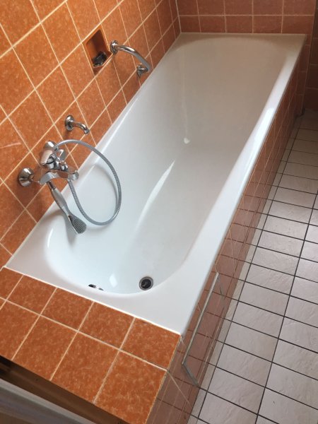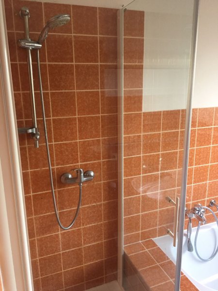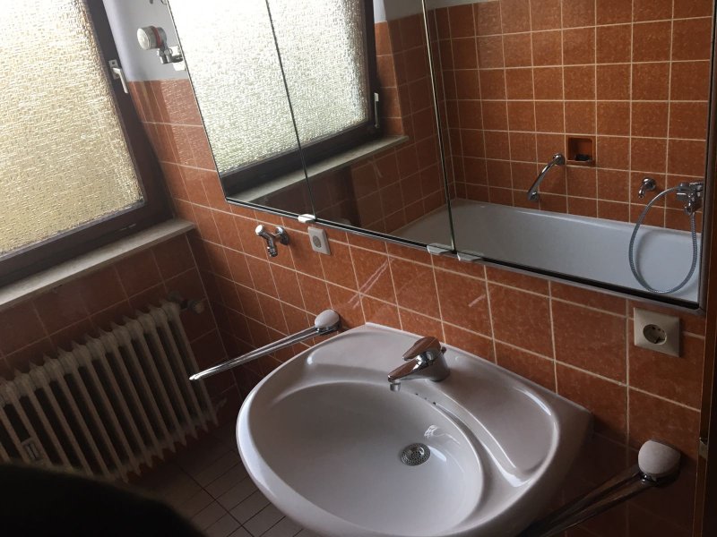 Das Tageslichtbad hat eine Badewanne sowie eine Dusche und einen Spiegelschrank mit 3 Abteilen, einen für jeden Mitbewohner.