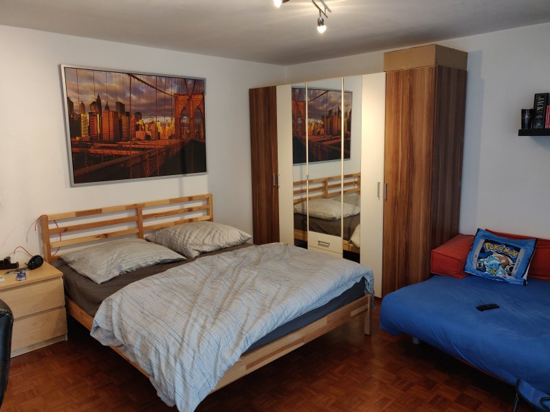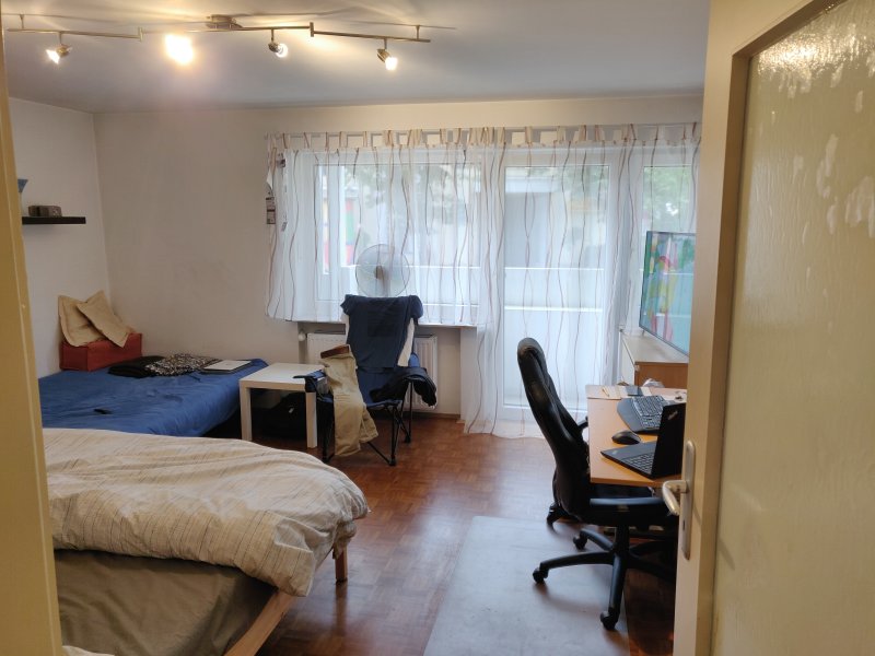 Das Zimmer wird voll möbliert vermietet, außer der Technik auf den Bildern. Schrank, Bett, Sofa, Tisch also inklusive. Große Fenster mit Rolläden und Sonne ab Nachmittag.