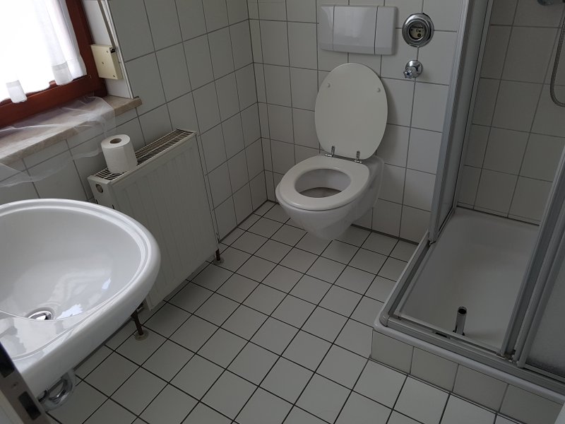 Duschbad mir großem Fenster, Spiegelschrank, Toilette, Waschbecken, Dusche (Boiler).