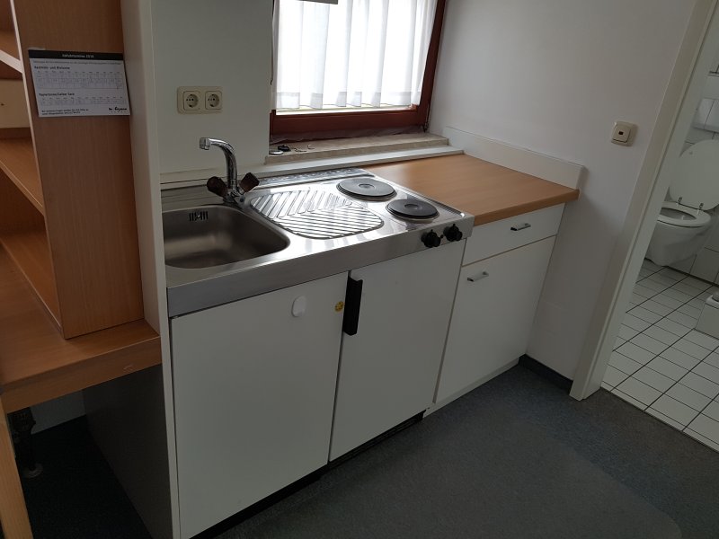 Das helle Zimmer hat 2 große Fenster im Arbeitsbereich, Schreibtisch ,Stuhl, Regal, Unterschrank.
