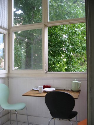 Von hier geht ein verglaster Balkon ab, auf dem auch geraucht werden darf.