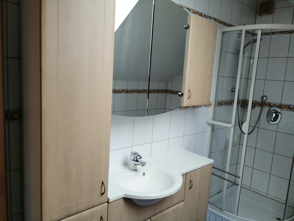 - Bad mit Dusche, Badschrank, Urinal und Waschmaschine