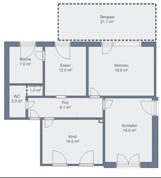 1 Kellerraum, 1 Küche, 1 Schlafzimmer, 1 Bad mit Dusche,1 Esszimmer, 1 Kinderzimmer, 1 Flur und 1 Wohnzimmer.