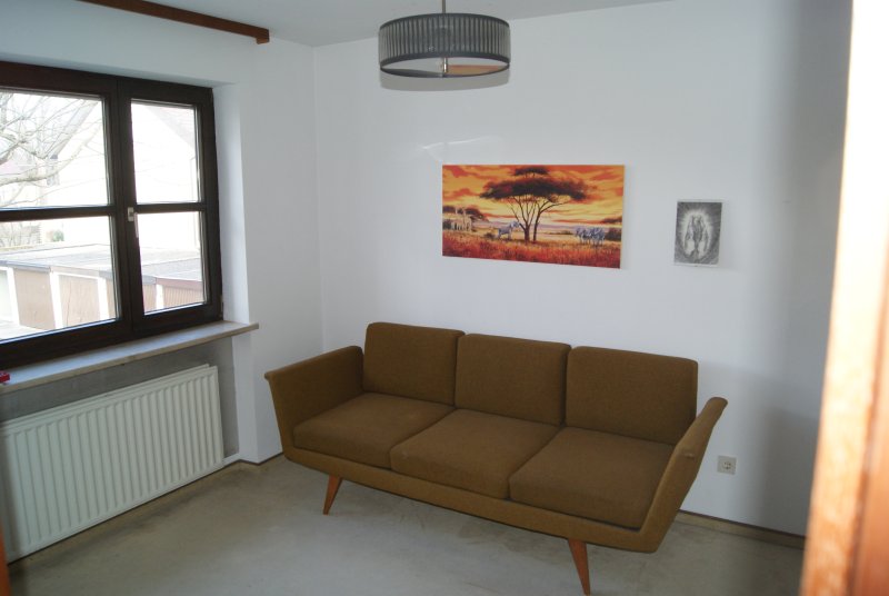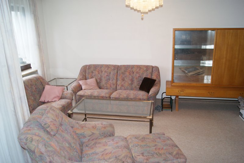 Im EG befindet sich ein großes Wohnzimmer (mit Schrankwand, orig. 50-er Jahre Designerschrank, 2 Sofas, Couchtisch und Polstersessel, Eßtisch mit 4 Stühlen) mit Ausgang auf die Südterrasse und in den Garten, Küche mit Einbauküche, Windfang und Gäste-WC.