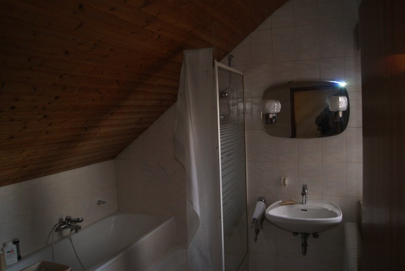 Im 2.Stock befindet sich das ausgebaute Dachstudio mit einer weiteren Einbauküche mit rustikaler Sitzecke, sowie ein Doppelbett, ein Kleiderschrank mit Spiegeltüren, ein Couchtisch, ein Polstersessel sowie ein Lederfernsehsessel mit Fußstütze sowie ein weiteres Badezimmer mit WC, Badewanne, Dusche, Bidet und einem Waschbecken.