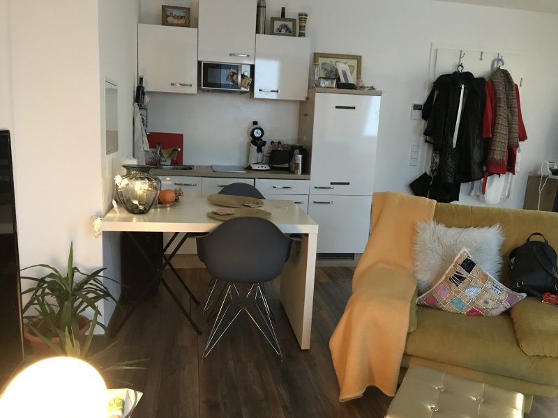 - eine offene Einbauküche mit Induktionsherd sowie Kühlschrank mit Gefrierfach,