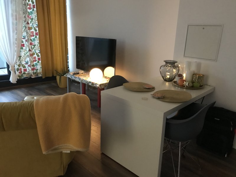 - einen kleineren, zusätzlichen Raum mit weißer Schiebetüre, welcher als Schlafzimmer eingerichtet ist.