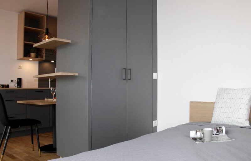 Komfort und Exklusivität zeichnen dieses geschmackvoll eingerichtete Luxus-Apartment in einem neu erbauten Mehrfamilienhaus aus. Dank der cleveren Raumaufteilung des Business Apartments und der individuell angepassten Schreiner-Möbel bietet das 30 qm große Apartment genug Platz für eine voll ausgestattete Küchenzeile mit Spülmaschine, einen Arbeits- und Essplatz, eine gemütliche Fernsehecke, einen optisch abgetrennten Schlafbereich, ein modernes Badezimmer mit einer großen ebenerdigen Dusche und eine schöne Terrasse.