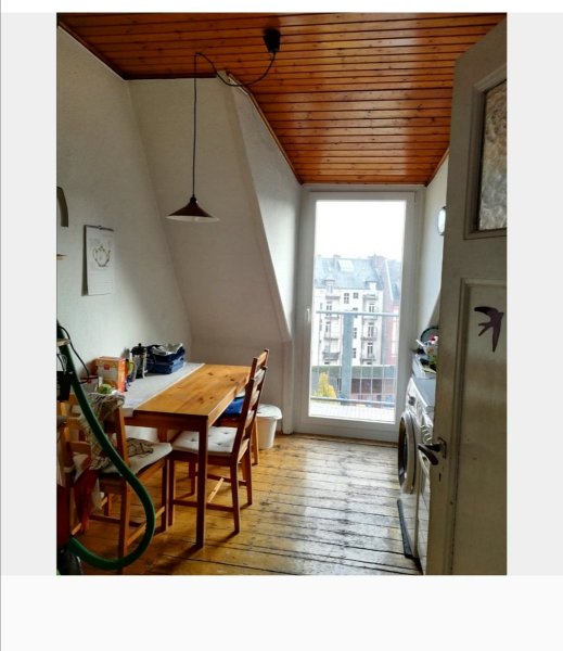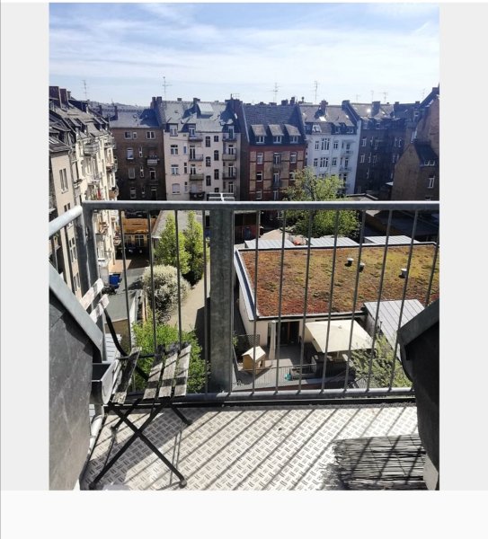Die ca. 75qm große 3er-WG (inkl. 2 Balkone) befindet sich im 4. Stock, in der die Räume wie Küche (inkl. Balkon), Bad und ein WG-Zimmer zur Innenhofseite und die 2 anderen WG-Zimmer (eins inkl. Balkon) zur Straße hin ausgerichtet sind. Das freiwerdende WG-Zimmer bietet mit ca. 18qm genügend Raum für größere Möbel und Stauraum. Der Blick fällt dabei auf einen Teil des Elsässer Platzes.