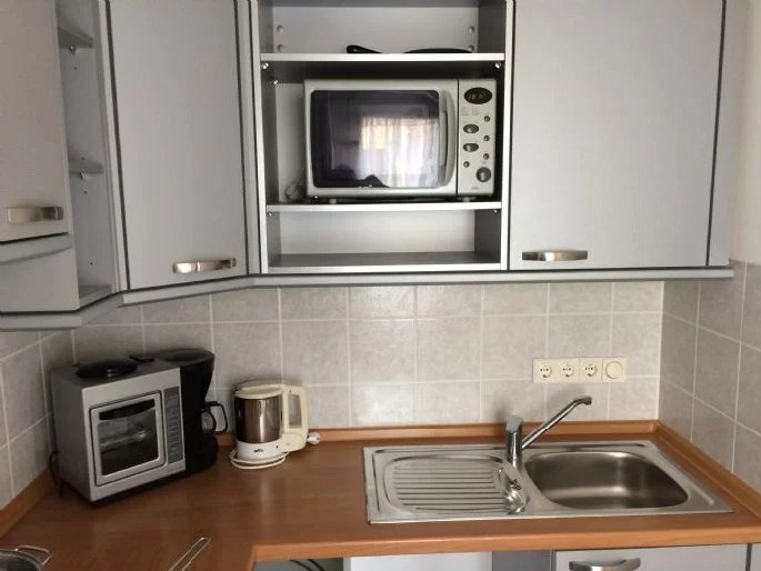 Komplett ausgestattete Markenküche, inkl. Ceranfeld, Backofen, Dunstabzug, Mikrowelle, Geschirrspüler, Kühl-/Gefrierkombi, Geschirr, Besteck, Gläser, Töpfe und Pfannen sowie Kochutensilien, Wasserkocher, Toaster, Kaffemaschine