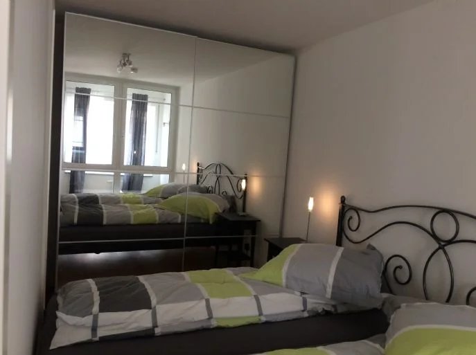 200 cm breiter neuer Spiegelschrank, 180 cm breites Bett, Nachttische, Decken, Bettwäsche