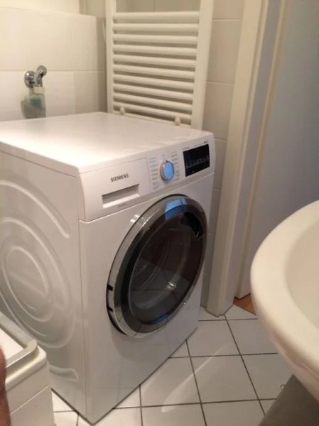 Duschkabine, Waschbecken, Unterschrank, Waschtrockner, Hand- und Duschtücher