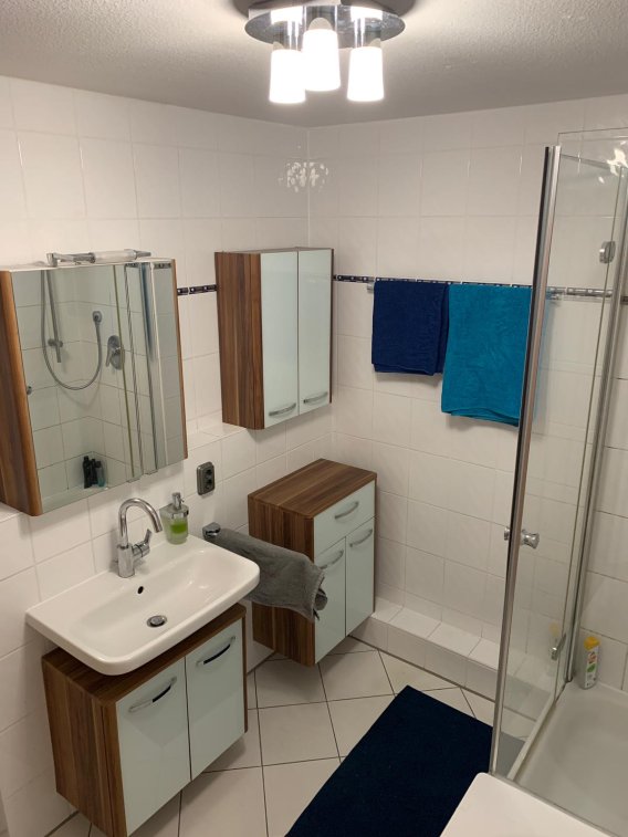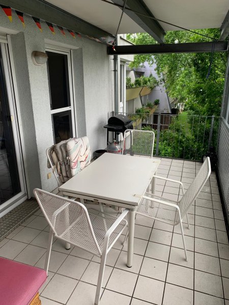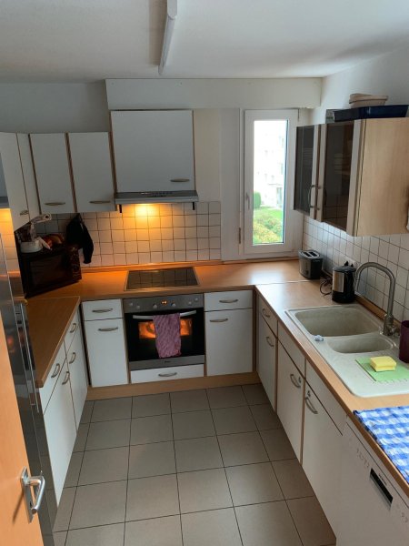 Die Wohnung im zweiten Stock hat eine gesamte Wohnfläche von 103 qm. Die Küche ist mit allen Elektrogeräten voll ausgestattet. Dazu gehören Spülmaschine, Cerankochfelder, Backofen, Kaffeemaschine, Wasserkocher, Toaster und Mixer sowie eine vollständige Ausstattung an Kochutensilien. Das große Wohn- und Esszimmer bietet sich gut für gemeinsame Abende an. Ein großer TV steht auch für gemeinsame Filmabende zur Verfügung. Vom Wohn- und Essbereich gelangt man auf den wunderschönen großen Süd-Westbalkon. Hier finden gemeinsame Grillabende statt. Die Wohnung hat ein separates WC. Das Bad besitzt dazu eine Dusche sowie auch eine Badewanne. Zusätzlich gehören zur Wohnung noch ein gemeinsamer Keller, eine Waschküche mit Waschmaschine und eine Fahrradhütte.