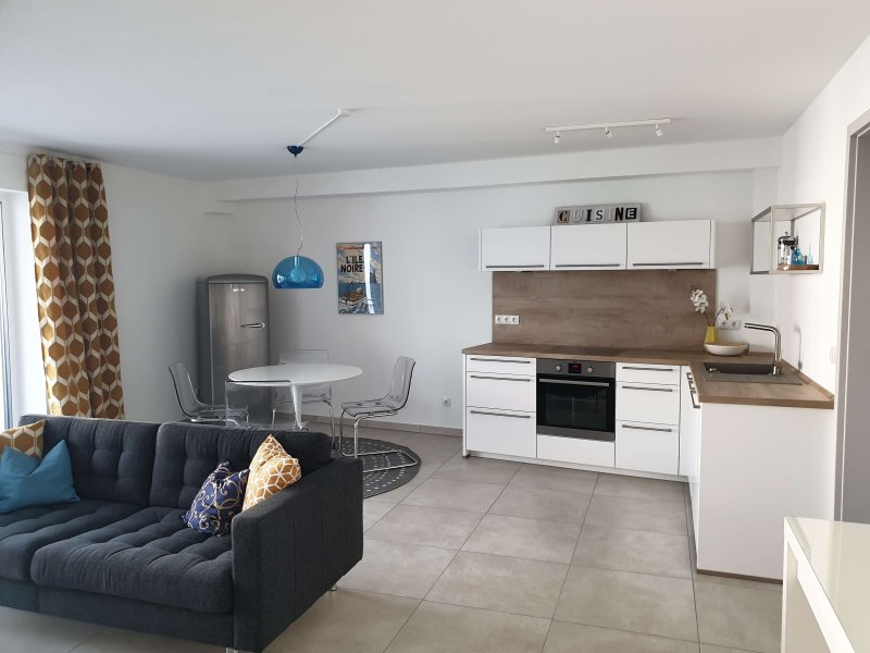 Das Apartment verfügt über ein Schlafzimmer, einen großen Flur, einen Abstell- und Wäscheraum, großzügiges Bad sowie einen großen, hellen und geschmackvoll eingerichteten Wohnraum mit integrierter moderner Küche und gemütlichem Essbereich. Die Einrichtung ist hochwertig und dezent. Der Wohnbereich ist mit einem bequemen Sofa und Sessel, USM-Haller Sideboard, 52“ Smart TV, Couchtisch, kuscheligem Teppich, Kommode und geschmackvoller Beleuchtung ausgestattet. Die offene Küchenzeile verfügt über Spülmaschine, Retro-Kühlschrank, Backofen, Induktions-Herd, Wasserkocher sowie sämtliche Kochutensilien und Geschirr. Der gemütliche Essbereich besteht aus einem geschmackvollen Tisch und vier Stühlen. Im großzügigen Flur befinden sich viele Aufbewahrungsmöglichkeiten: eine helle, große Regalwand, Kommode, Schuhschränke und Garderobe. Ein eleganter, großer Spiegel rundet die ansprechende Optik ab. Der Hauswirtschaftsraum verfügt über einen Samsung Waschtrockner, Bügeleisen mit Bügelbrett, einen Staubsauger sowie weitere Reinigungsutensilien.Im hellen Schlafzimmer erwartet Sie ein 140x200 großes, modernes Doppelbett mit zwei Nachttischchen und Leselampen, ein Lesesessel sowie ein geräumiger Kleiderschrank. Eine schicke Arbeitsecke mit Schreibtisch, Container und Schreibtischstuhl steht Ihnen hier ebenfalls zur Verfügung. Das Bad hat eine geräumige Duschkabine, ein großzügiges Waschbecken und Spiegel mit integrierter Beleuchtung.