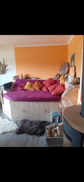Die Wohnung hat ein grosses Wohnzimmer mit Kamin und einen kleinen Garten mit Feuerstelle und Hochbeeten zur gemeinsamen Nutzung sowie einen Abstellraum.
