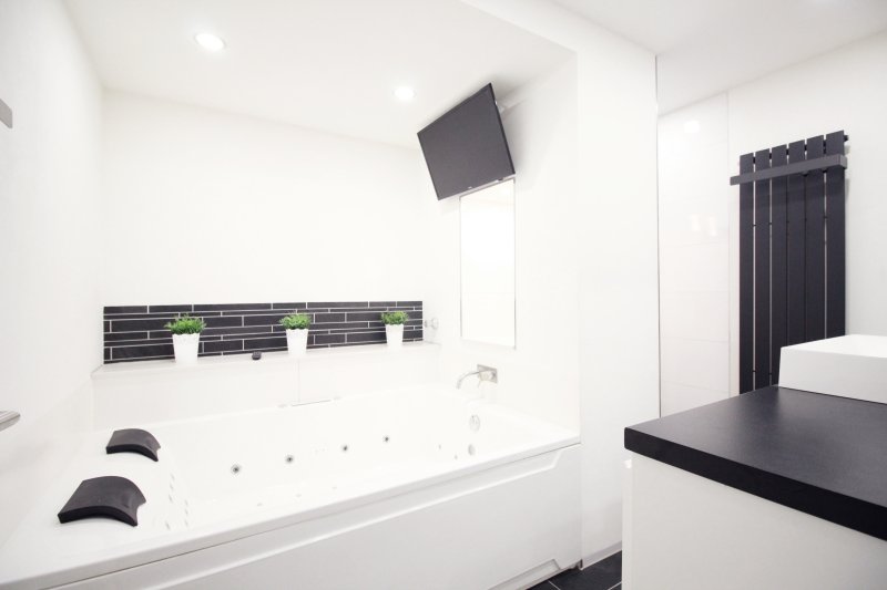 2 Personenwanne mit Wirlpooleinrichtung und Fernsehzerstreuung, eine Extravagante Einbauküche mit allen Komfort, ein sehr geräumiges Wohnzimmer sowie ein Schlafzimmer mit Boxspringbett, Einbauschränken und Fernseher.