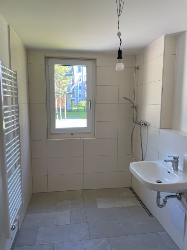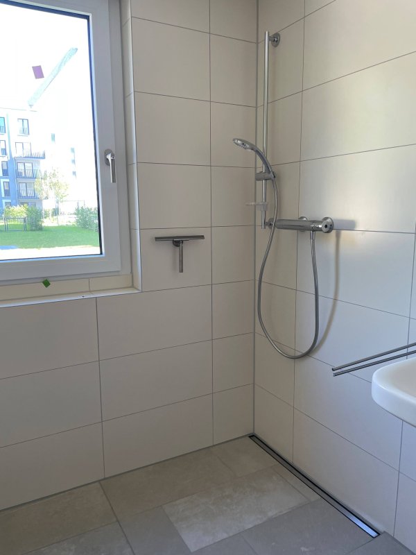 Tageslicht-Bad mit bodengleicher/begehbarer Dusche und Glastrennwand,