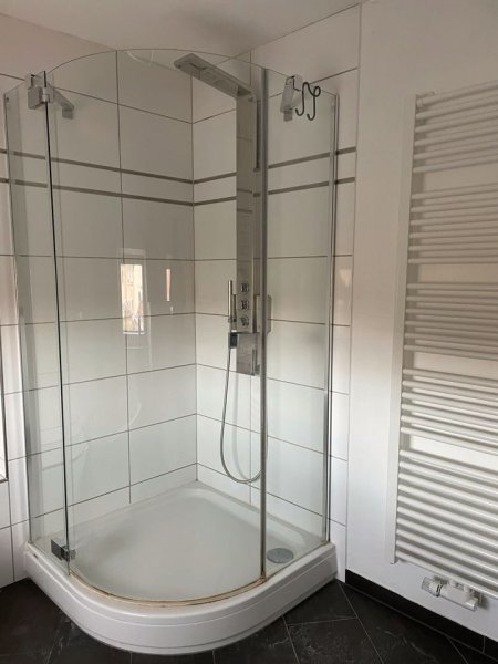 1 Badezimmer mit Dusche (Ganzglasdusche), Eckbadewanne und Fenster
