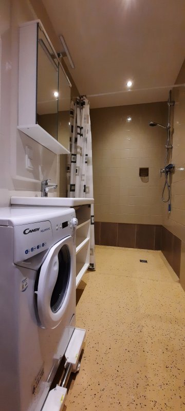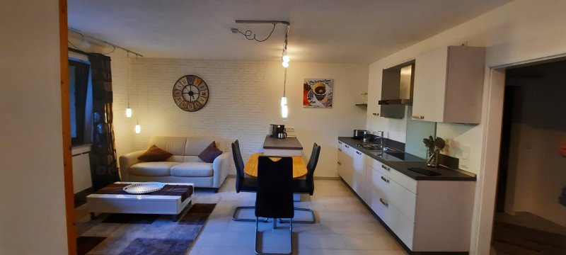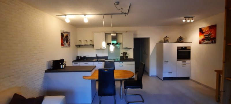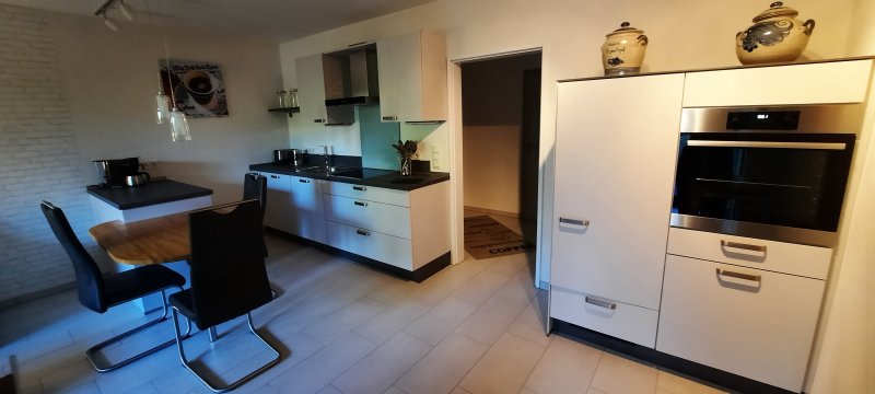 Die neue Küche ist sehr gut ausgestattet mit Kühl-Gefrierkombination, Spülmaschine, Cerankochfeld, Backofen und Dunstabzug. Ein integrierter Esstisch rundet den Kochbereich ab.