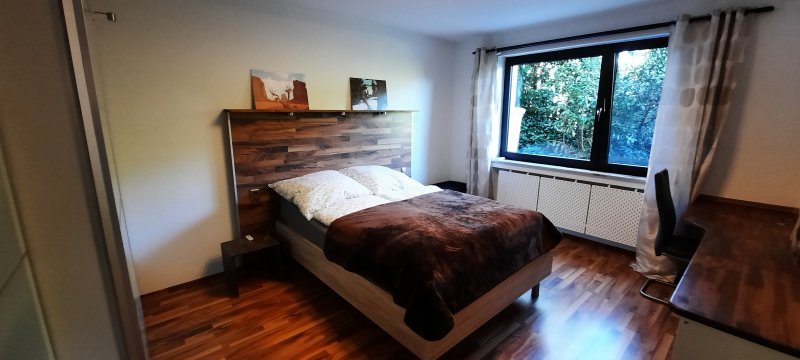 Das separate Schlafzimmer ist mit einem 140 cm breitem Bett, Kleiderschrank sowie mit einem Schreibtisch ausgestattet.