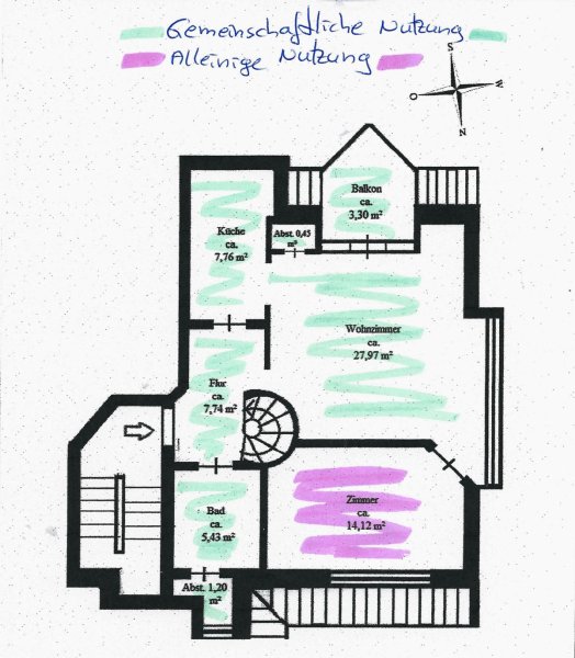 Die Wohnung ist mit einer Einbauküche und einem großen Wohn- u. Esszimmer, sowie einem Balkon zur gemeinschaftlichen Nutzung ausgestattet.