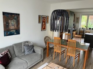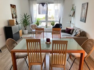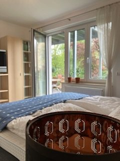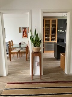 Die Wohnung ist mit einem hochwertigen, warmen Vinylfußboden belegt und das schmale Tageslichtbad (5,5qm) ist mit modernen Platten, Wandheizung und Dusche ausgestattet. Von der großzügigen und lichtdurchfluteten Eingangsdiele (7qm) mit Garderobe, Schuhschrank und Spiegel gelangen Sie in das gemütliche Wohnzimmer (20qm) mit tiefen Fenstern und dem angrenzenden Essbereich mit ausziehbarem Esstisch (Ligne Roset). Die offene Küche (15qm) (Leicht- Einbauküche) ist vollständig ausgestattet und verfügt über eine Theke und eine offene Abstellkammer mit Waschmaschine und Putzzubehör. Man gelangt zum großen Ost-Süd Balkon (11qm) mit Sitzmöglichkeiten und Holztisch über zwei separate Balkoneingänge. Das Schlafzimmer (13qm) (Gartenseite) ist mit einem 1,80m Bett, 2 Nachttischchen und Wandschrank eingerichtet. Das Arbeits- bzw. Gästezimmer (19qm) (Straßenseite) verfügt über ein aufklappbares Bettsofa, einem hochwertigen Schiebetürenschrank, Kommode und Regal. Die Wohnung besticht insbesondere durch die gelungene direkte und indirekte Beleuchtung und das freundliche Mobiliar mit Liebe zum Detail.