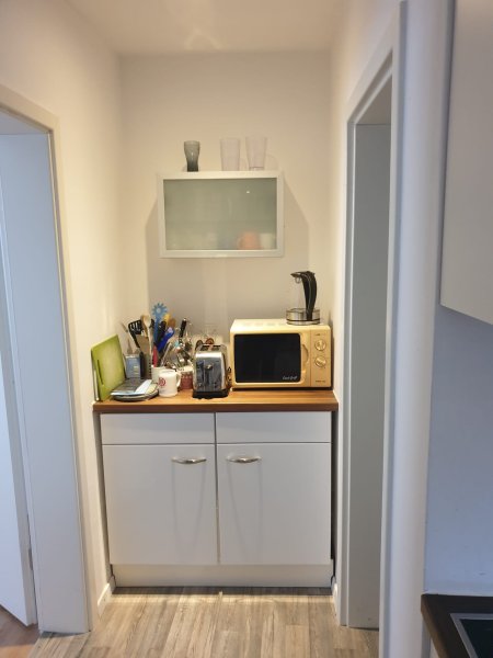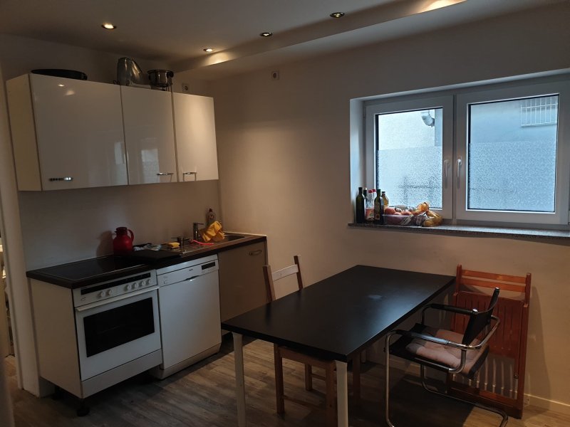 In der WG befindet sich eine gemütliche Wohnküche. Diese ist mit Herd, Kühlschrank und Geschirrspüler ausgestattet. Das Tageslichtbad ist sehr modern mit großen Hochglanzfliesen in schwarz-weiß gefliest. Ein Waschmaschinen- und Trockneranschluss ist im Bad vorhanden. Die Geräte müssen aber mitgebracht oder angeschafft werden. Ebenso wie das Geschirr für die WG-Küche.