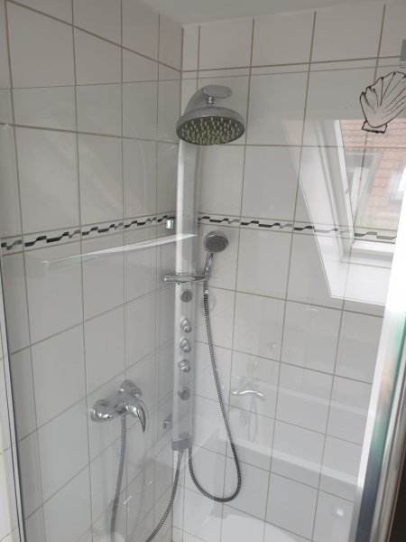 Das Badezimmer der Wohnung ist modern gestaltet und verfügt über eine Duschkabine sowie eine Badewanne.
