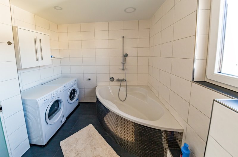 Bad mit Eckbadewanne, WC, Urinal, Waschbecken, Spiegelschrank, Waschmaschine, Trockner, Fön, Bügelbrett und Bügeleisen.