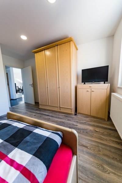 2 Schlafzimmer mit Doppelbett bzw. Einzelbett, Kleiderschrank, Schreibtisch und Fernseher.