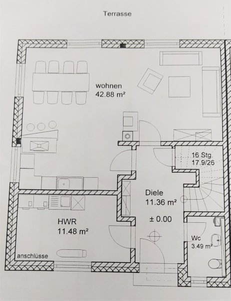 Im Erdgeschoss befinden sich das Wohn- und Esszimmer, die Küche, der HWR mit Gasheizung, ein Gäste-WC und der Flur. Bodentiefe Fensterelemente sorgen für gute Lichtverhältnisse und bieten direkten Zugang zur Terrasse sowie zum Garten.