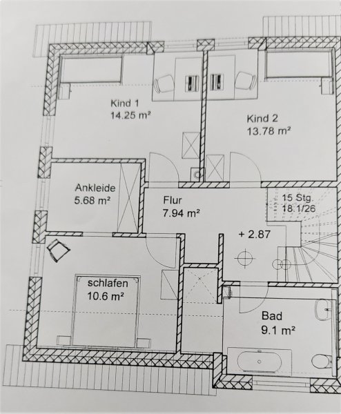 Das Obergeschoss ist durch das Elternschlafzimmer, zwei Kinderzimmer, das Badezimmer, einen Umkleideraum und den Flur geprägt.
