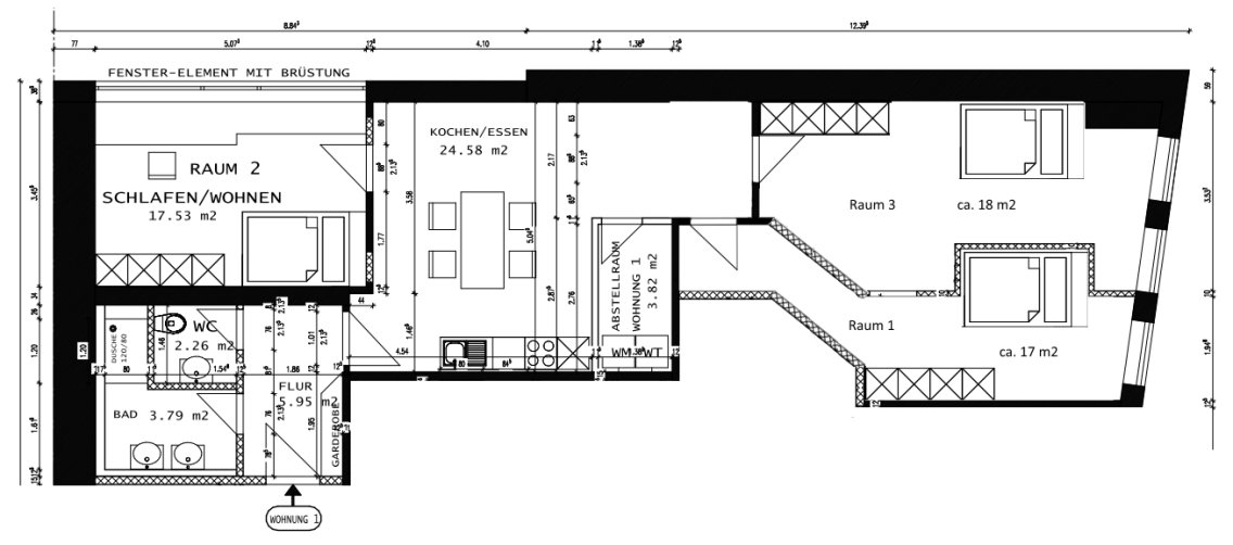 Auf dem Plan ist das Zimmer mit Raum 1,2,3 gekennzeichnet.