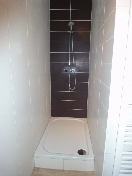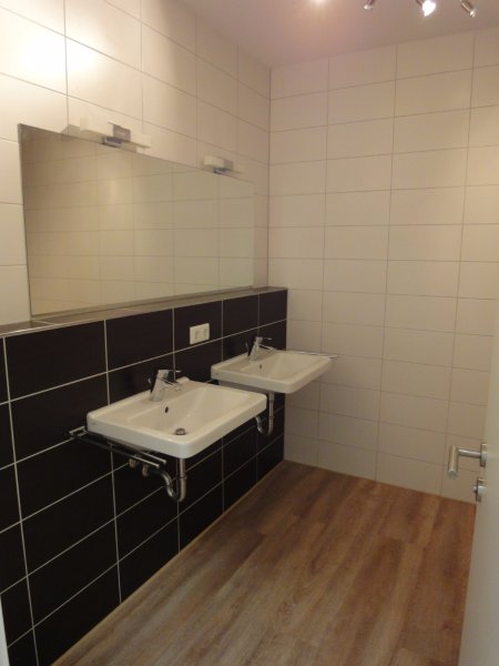 Das moderne Innen Bad besitzt zwei separate Waschbecken und eine große begehbare Dusche. Das WC ist in einem separatem Raum