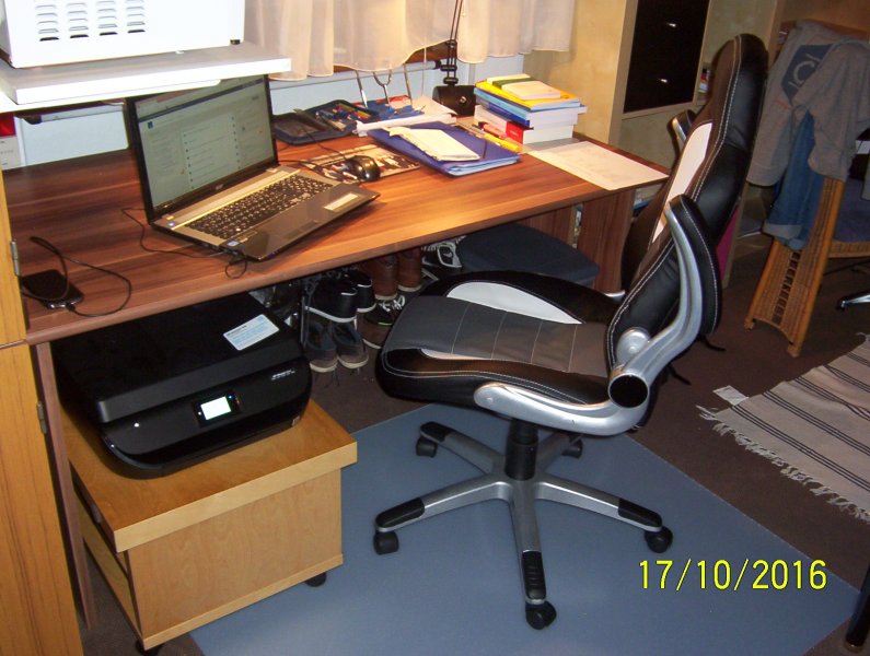Vor dem Fenster steht ein neuer ,extrem großer Power-Schreibtisch mit den Maßen B/H/T 160 cm /75 cm / 80 cm in Walnußbaum-Nachbildung mit Kabelaussparung in der Mitte hinten!