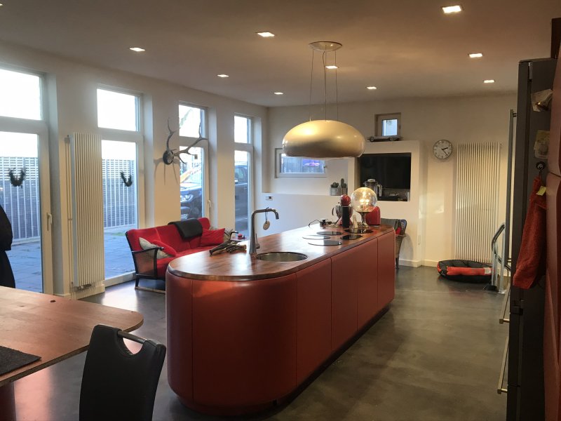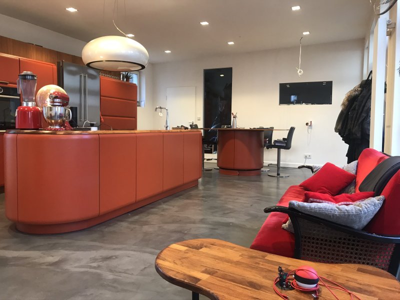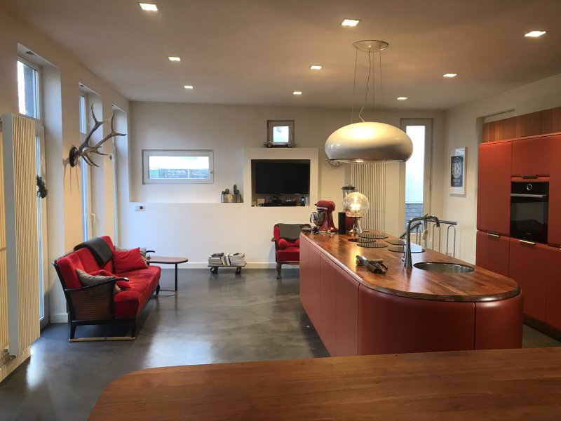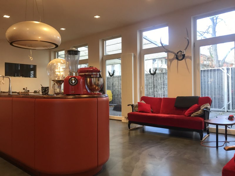 Das Loft besteht aus einem Wohn-/Essraum mit angrenzendem Schlafzimmer, das Loft ist eigentlich 160 qm groß, ein Teil ist abgeschlossen, dort befinden sich meine privaten Dinge. Großzügiges Bad mit Hotelatmosphäre, offener Dusche, Betonwaschbecken.